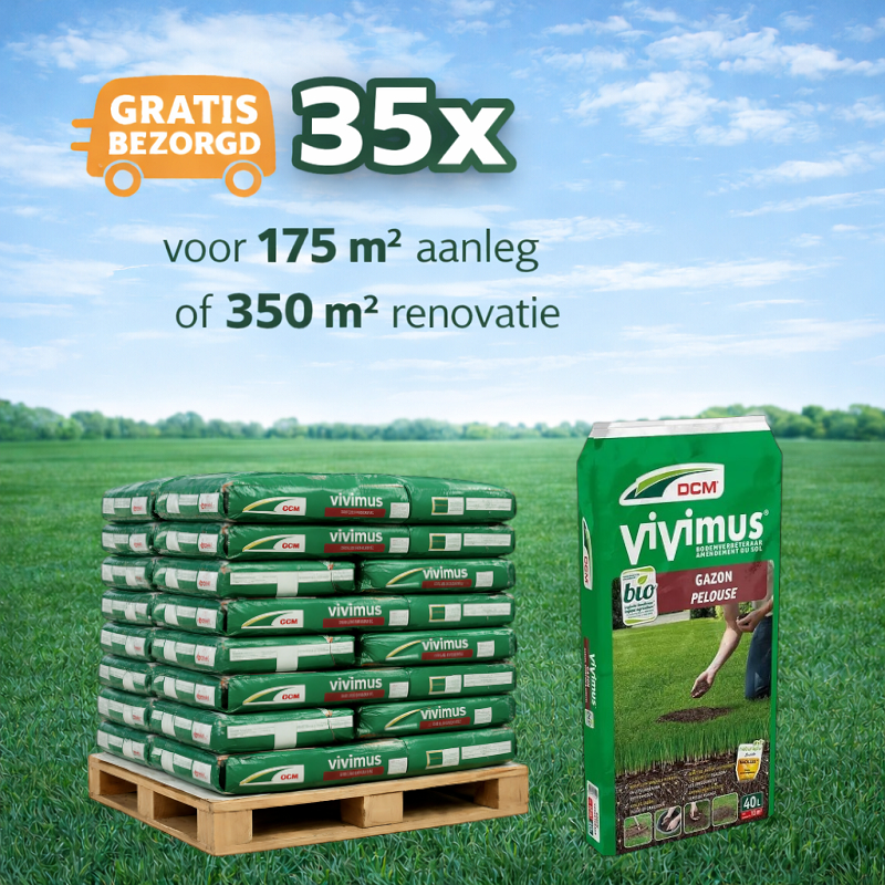 Wil je je gazon aanleggen of renoveren? Dan is deze mini-pallet met 20 zakken van 40L Vivimus gazon bodemverbeteraar een voordelige optie. Met deze 20 zakken kun je ongeveer 100 m² nieuw gazon aanleggen door middel van inzaaien of graszoden, en 200 m² gazon renoveren door te verticuteren en door te zaaien. Een prachtige, groene grasmat begint met een gezonde bodemstructuur. Veel tuinproblemen, waaronder die met gazons, zijn vaak te herleiden naar de bodemconditie. Gelukkig biedt DCM Vivimus Gazon bodemverbeteraar een oplossing om je gazon nieuw leven in te blazen! Deze speciaal samengestelde bodemverbeteraar is ideaal voor zowel de aanleg als het herstel van grasvelden. Het bevordert de snelle groei van wortels en de ontkieming van graszaden, en zorgt voor een luchtige, voedingsrijke bodem.