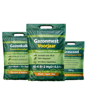 Voor een compleet onderhoudsplan kan gazonkalk worden gecombineerd met gazonmest voorjaar, gazonmest zomer en gazonmest najaar. Voor volledig gazononderhoud gedurende het jaar is het gazonmest jaarpakket een logisch alternatief. Bij structurele mosproblemen kan aanvullend onderhoud met mos en onkruid in het gazon nodig zijn.