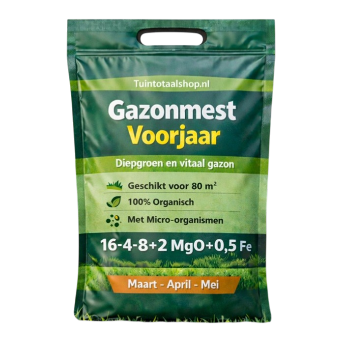 De voorjaarsmest heeft een NPK-verhouding van 16-4-8 en is verrijkt met magnesium en ijzer. Deze samenstelling ondersteunt zowel groei als kleur en zorgt voor een gelijkmatige afgifte van voedingsstoffen.